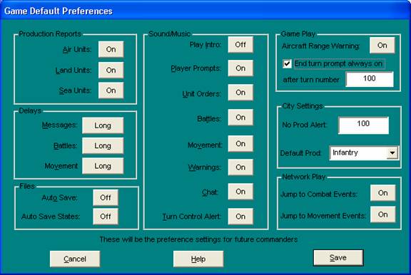 Setting the preferences for future commanders by selecting Help-New User Preferences in the main screen
