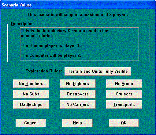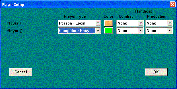 Scenario Values Screen The Player Setup Menu will appear next. This screen shows two players listed. You will be player one. We want the computer to be player two, so go to the line marked Player 2 and click on the button labeled Person - Local. A pop-up menu will appear listing various player types. Click the option Computer - Easy. Computer - Easy should now appear in the list for Player 2. Also note the colors listed in this dialog. Your units will be the color shown for player # 1 (displayed below as orange). Go down to the bottom of the Player Setup Menu and select OK.