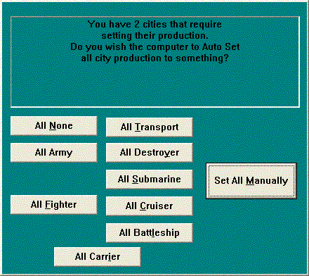 Auto Set Production Dialog You will start this game with two cities, Melbourne and Breed's Hill. The computer will start the game with one city, Denver. At the very beginning of the game, Empire Deluxe asks you what you wish to produce at each city you own. Select “Set All Manually”. Then a Production Menu for either Breed’s Hill or Melbourne will appear.