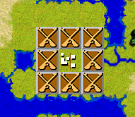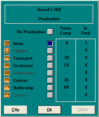 Production Menu Screen Eight buttons will appear listing the eight different units available to you in the standard game. Three of them, Carrier, Fighter and Submarine, are ghosted. These units are not available in the basic game and will not be available to you in this tutorial. If the city is Breed’s Hill, as shown above, Select Army from the choices given and hit OK. If the city is Melbourne, click on the button marked Transport and then select OK. You can change these decisions later if you like but for now, leave them alone. Now that the production choices have been made, you will see the game screen in its entirety.