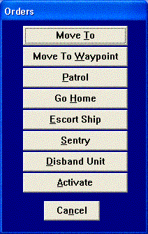 Using the mouse, move the pointer up to the top of the screen to the Game Menu and click on the option Commands. A pull down menu will appear with several other options. Highlight the command labeled "Survey Mode" and select it. This enters you into Survey Mode. From here you will be able to move the cursor about and study the map without accidentally issuing orders. The map is divided into many invisible squares to help define the rules of the game. Each square can be defined by its grid coordinates. For instance, the square at the top left corner of the map is square 1,1; the square at the top right corner of the map is square 28,1. If you want to learn about something on the map, simply move the mouse pointer over the desired square and click it. A brief description of the items located in that square in question will appear in the Message Bar at the top of the screen. You can get more information by double clicking the desired item. This will call up an Information Window with more information on that item. When you are done studying the Information Window, click on the button marked OK. This will return you to the map. So go ahead and do some exploring. Double click on interesting looking items on the map. Make sure to identify each of the eight terrain types and five unit types. If you accidentally exit Survey Mode, you may reenter it by clicking on the desired menu option or just clicking on the right mouse button while the pointer is on the map. Now, lets give orders to your units. All the units and cities belonging to you are the color that was indicated as Player #1’s color in the Player Setup Menu Screen covered previously. All the units and cities belonging to the computer player are are the color that was indicated as Player #1’s. You may only give orders to your own units. Empire Deluxe Internet Edition is played using a sequence of turns. Since you are player 1, you get to move all of your pieces first, then the computer player will get to go. Move the cursor over the top left corner of the map so that it rests on top of the Destroyer Higbee at square 1,1. Double click on the Higbee. When the pop-up information window appears, click on orders. A list of orders available to the Higbee will then appear in another pop-up window.